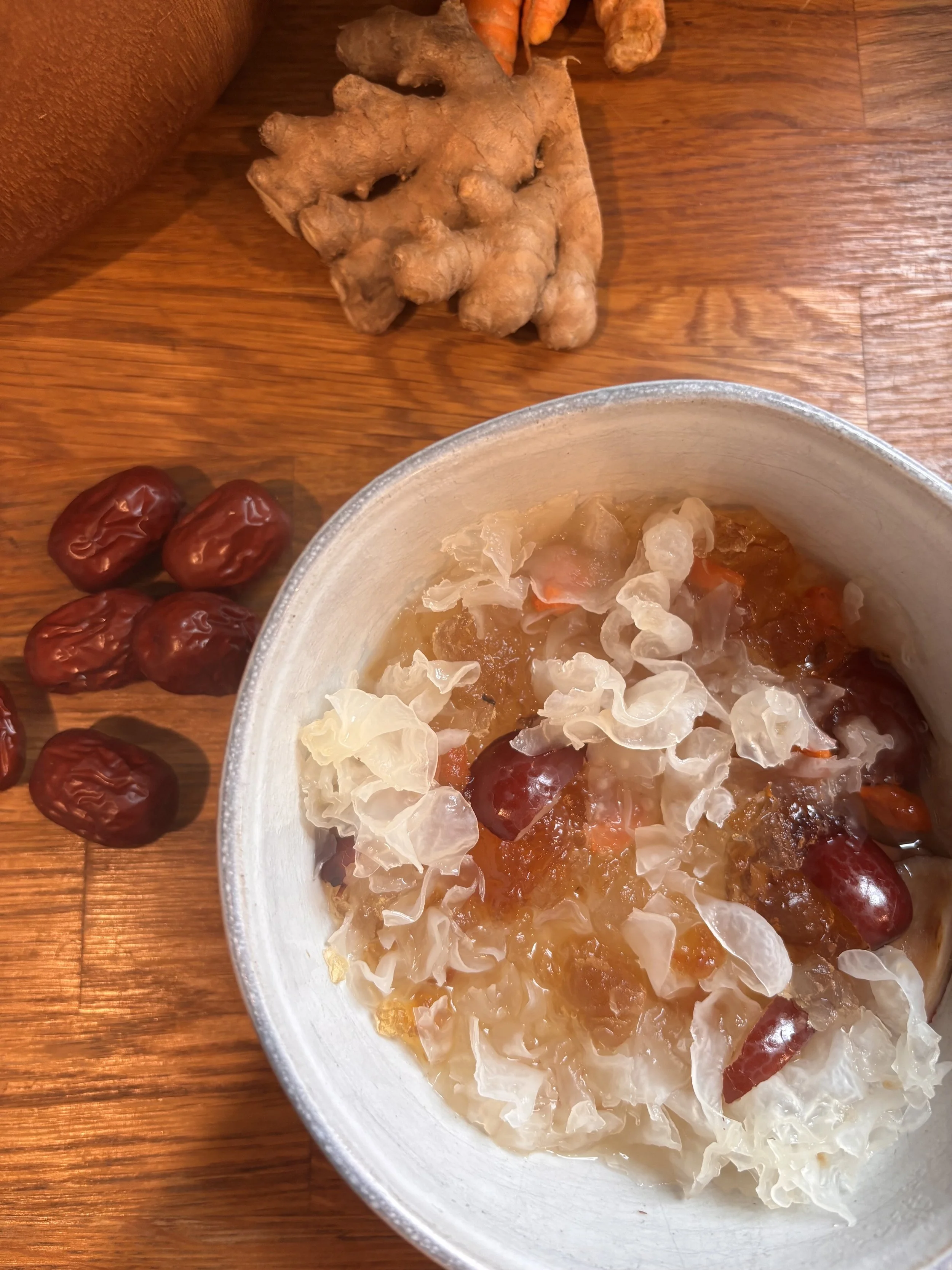Because Tremella is cooling, fresh ginger ensures the formula doesn’t weaken digestion. It warms the middle burner, reduces bloating, and keeps fluids circulating properly.